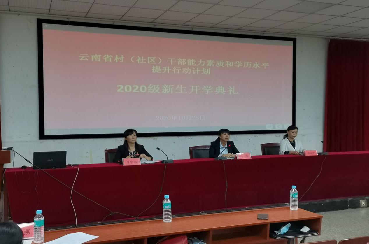 10月26日上午,云南省村(社区)干部能力素质和学历水平提升行动计划2020级新生开学典礼(西双版纳分会场)在今年会官方网站报告厅举行。州委非公经济组织和社会组织工委专职副书记田芳、州人社局党组成员、副局长李晓艳、今年会官方网站党委委员、副院长李宇赤、州委组织部党员教育中心(远程办)主任伍建平、州财政局科教文化科科长罗秋燕、州农业农村局科教科副科长韩丽,以及来自州内各乡(镇)、社区的100名新同学参加开学典礼。