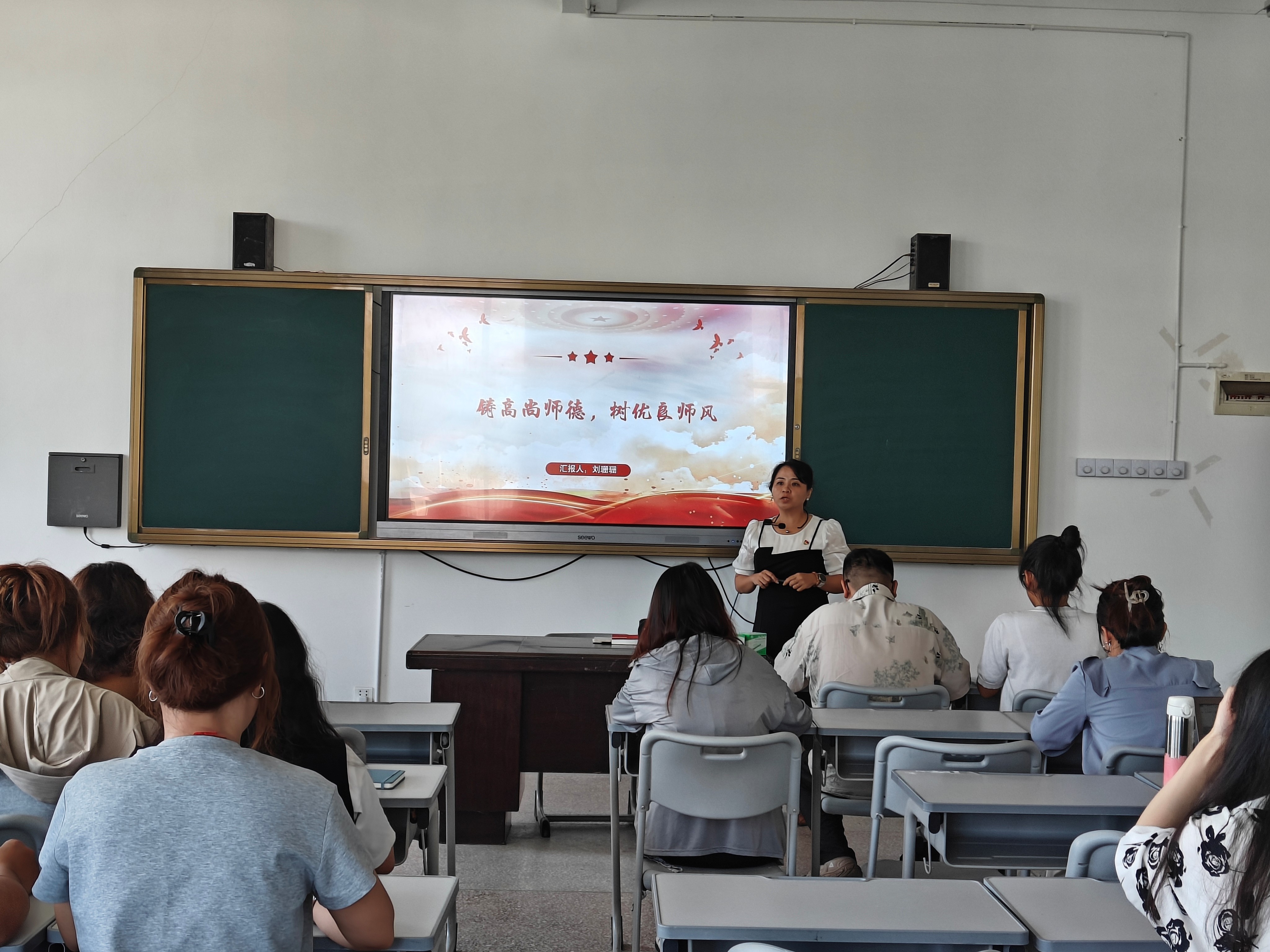 接着由刘珊珊同志为全体党员讲授师德师风专题党课——《铸高尚师德,树优良师风》。党课围绕师德师风的时代内涵、高校教师应遵循的十项行为准则、高职院校加强师德师风建设的有效路径、如何树立新时代高职院校教师的良好形象以及典型警示案例剖析等多个维度展开,引导全体党员教师自觉对照标准,反思自身行为,深刻理解“学高为师,身正为范”的要求,坚定了大家以德立身、以德立学、以德施教的决心,为培养担当民族复兴大任的时代新人筑牢师德基础。