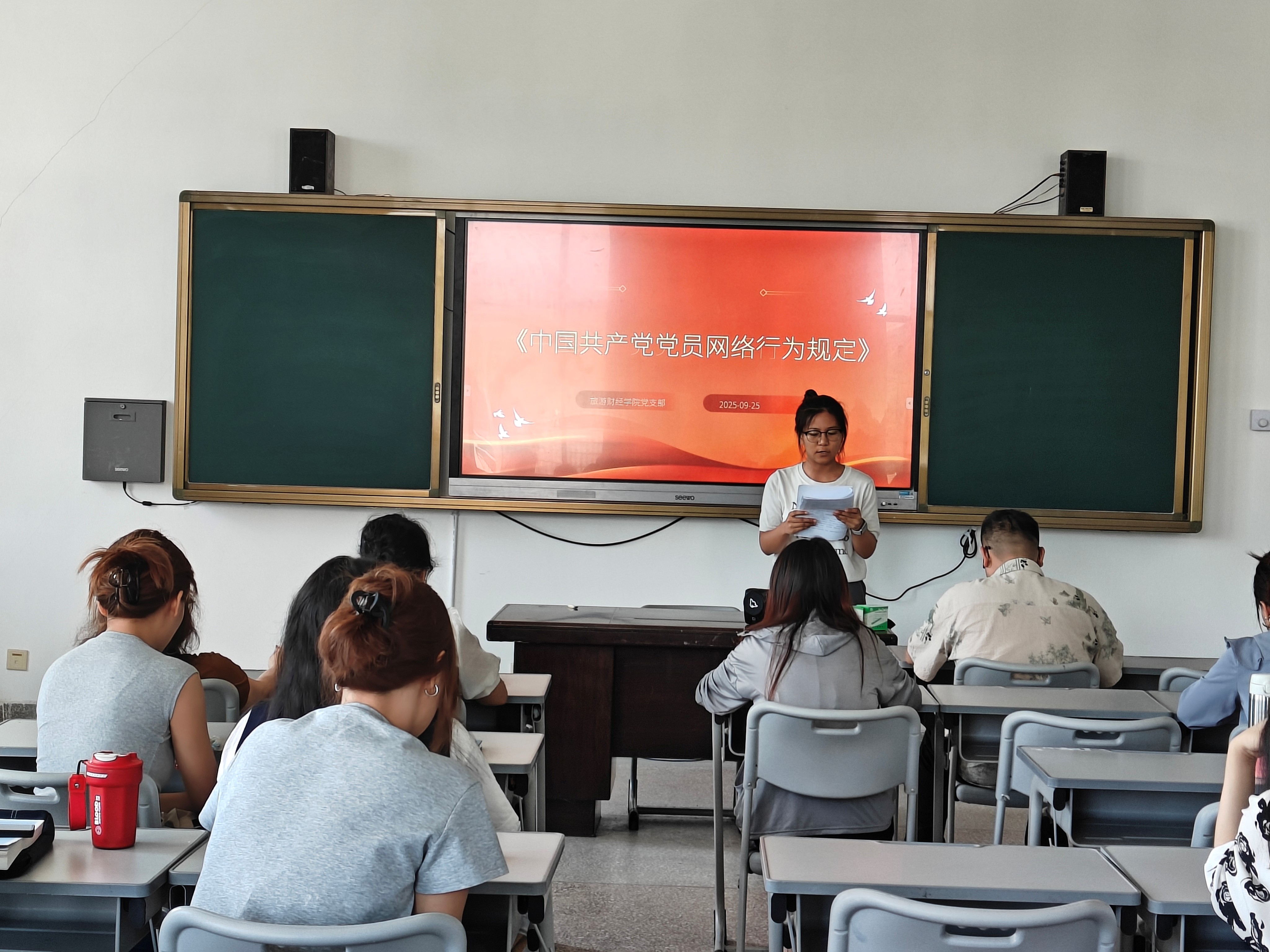 为进一步加强党员理论武装,提升党性修养,强化师德师风建设,规范党员网络行为,2025年9月25日,旅游财经学院党支部在旅游财经学院423教室组织开展了2025年第三季度党课学习活动。活动由党支部书记刘珊珊同志主持,支部全体党员参加。