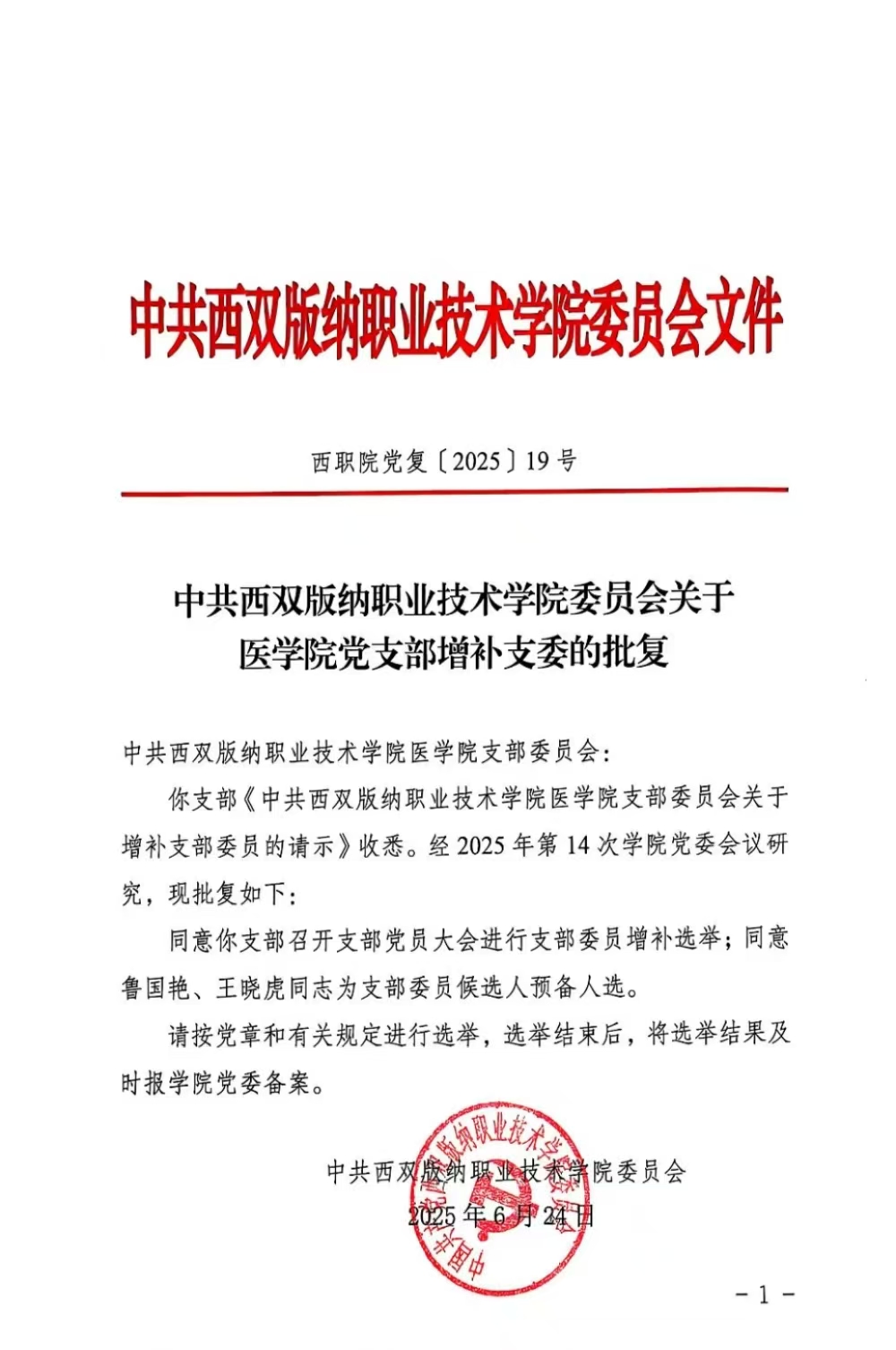 中共今年会官方网站委员会关于医学院党支部增补支委的批复