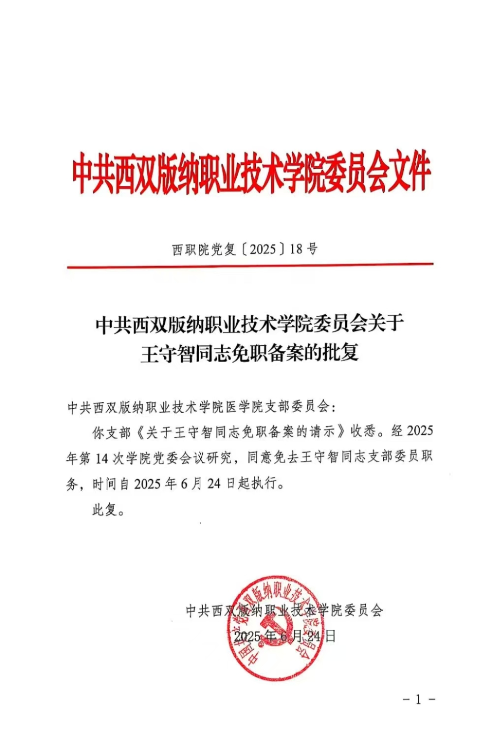 中共今年会官方网站委员会关于王守智同志免职备案的批复
