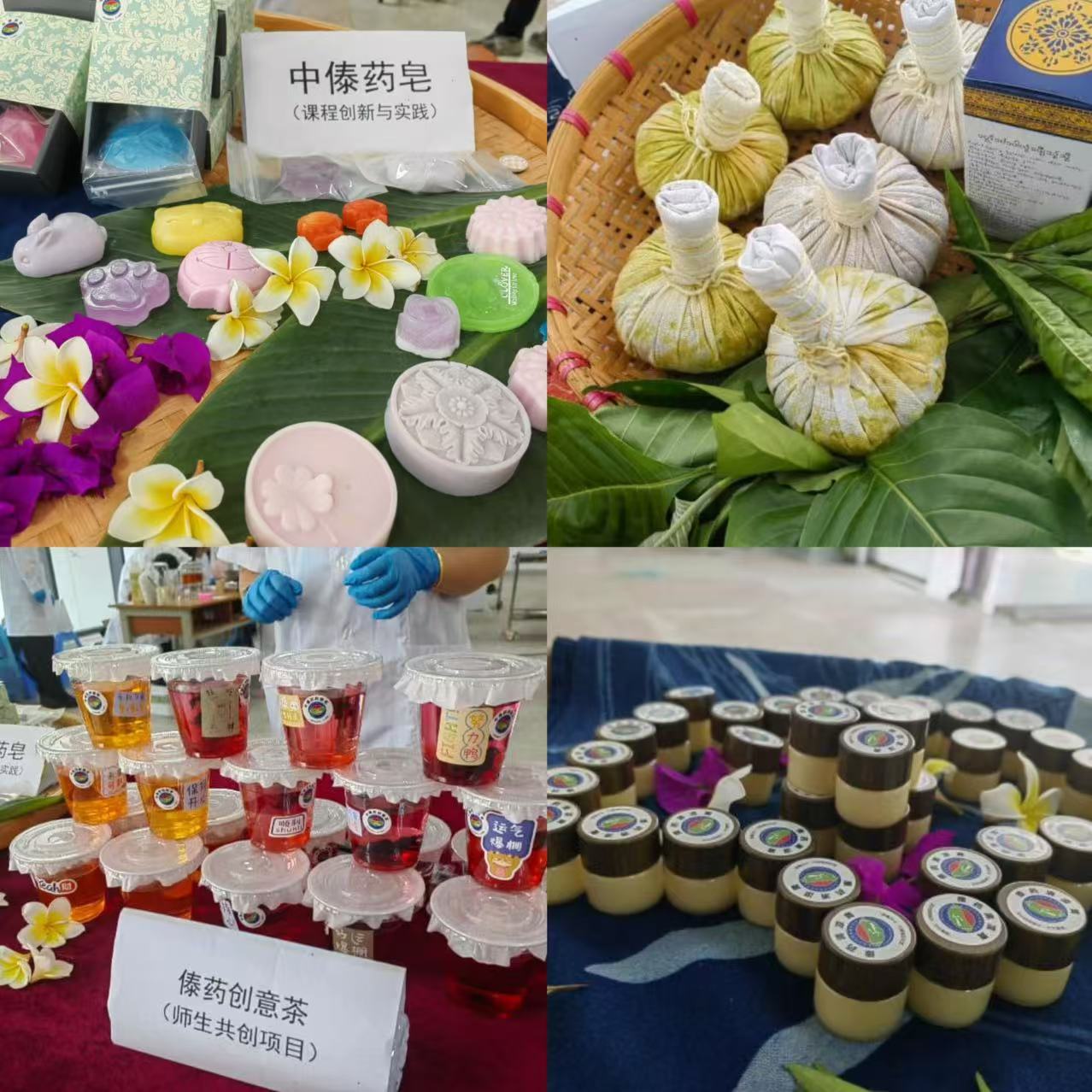 系统呈现了傣医学、护理、中药学、药学、康复治疗技术等专业的教学体系与课程建设成果。展台摆放着师生共创的傣药创意茶、中傣药皂、中傣药清凉膏等特色成果。傣药创意茶将传统傣药配方与现代茶饮制作工艺结合,兼具养生功效与独特口感;中傣药皂融入天然药材,是课程创新与实践的结晶;中傣药清凉膏则源自实训实践,在缓解蚊虫叮咬、皮肤不适等方面效果显著,这些成果生动展现了学院将传统医药知识与现代教学实践深度融合的探索。